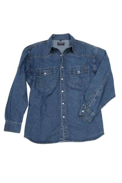 Zeer degelijk werkoverhemd van spijkerstof. Uitgevoerd met lange mouw en voorzien van parel(druk)knopen.